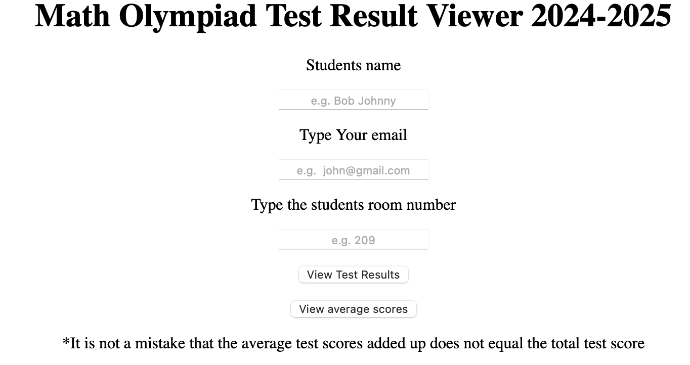 Math olympiad websiteThis is a website I made to view your scores in math olympiad if you are in my elementary school